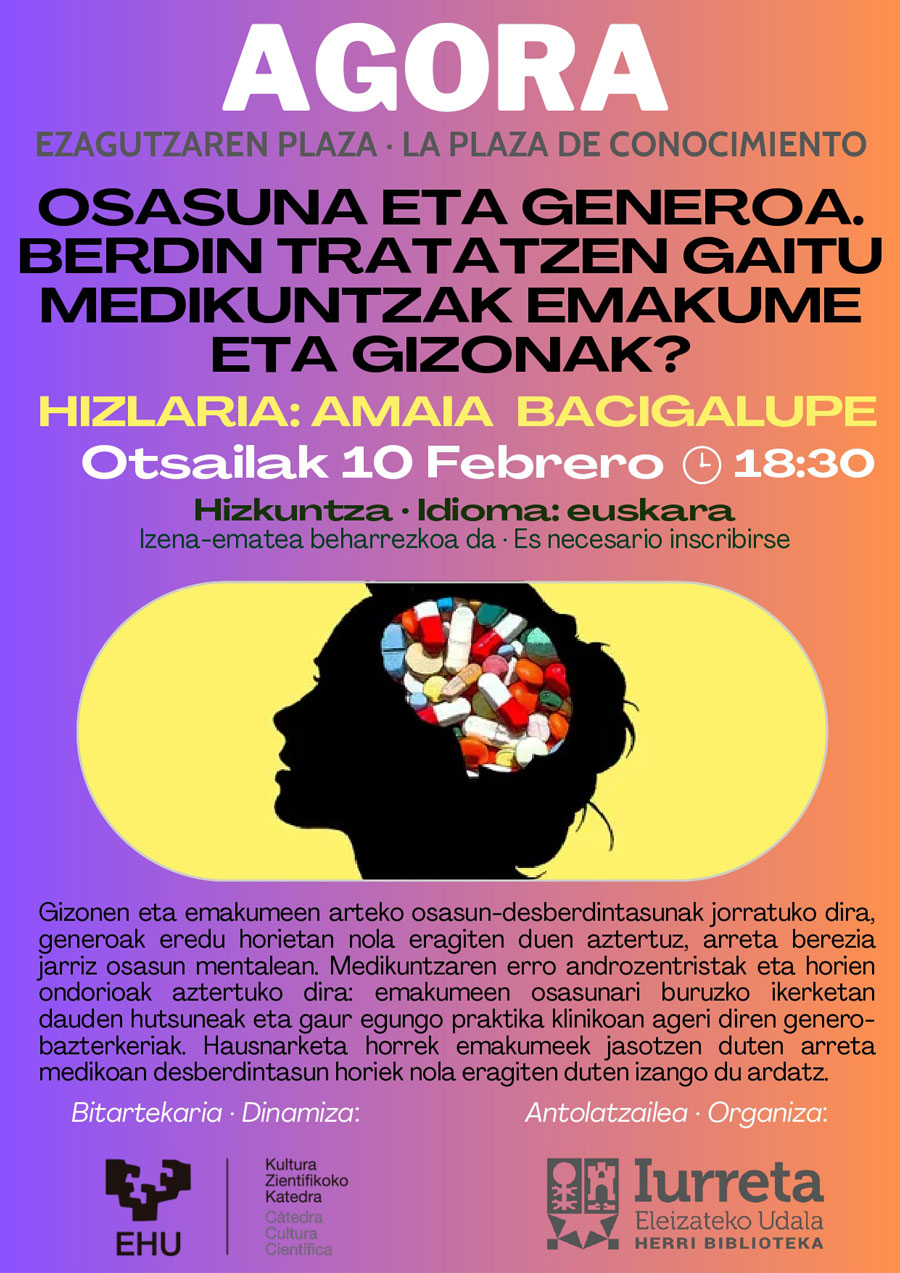 Gizonen eta emakumeen arteko osasun-desberdintasunak jorratuko dira, generoak eredu horietan nola eragiten duen aztertuz, arreta berezia jarriz osasun mentalean. Medikuntzaren erro androzentristak eta horien ondorioak aztertuko dira: emakumeen osasunari buruzko ikerketan dauden hutsuneak eta gaur egungo praktika klinikoan ageri diren genero-bazterkeriak. Hausnarketa horrek emakumeek jasotzen duten arreta medikoan desberdintasun horiek nola eragiten duten izango du ardatz.