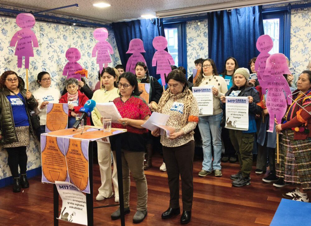 Un buen número de colectivos de trabajadoras del hogar y la plataforma Denon Bizitza Erdigunean secundan la huelga convocada por LAB, ELA, Steilas, Etxalde e Hiru para hoy, 17 de marzo, en Hego Euskal Herria. Esta jornada de movilización busca situar en el centro del debate político y social la mejora de los salarios, el reparto de la riqueza y el derecho a unas condiciones de vida dignas.