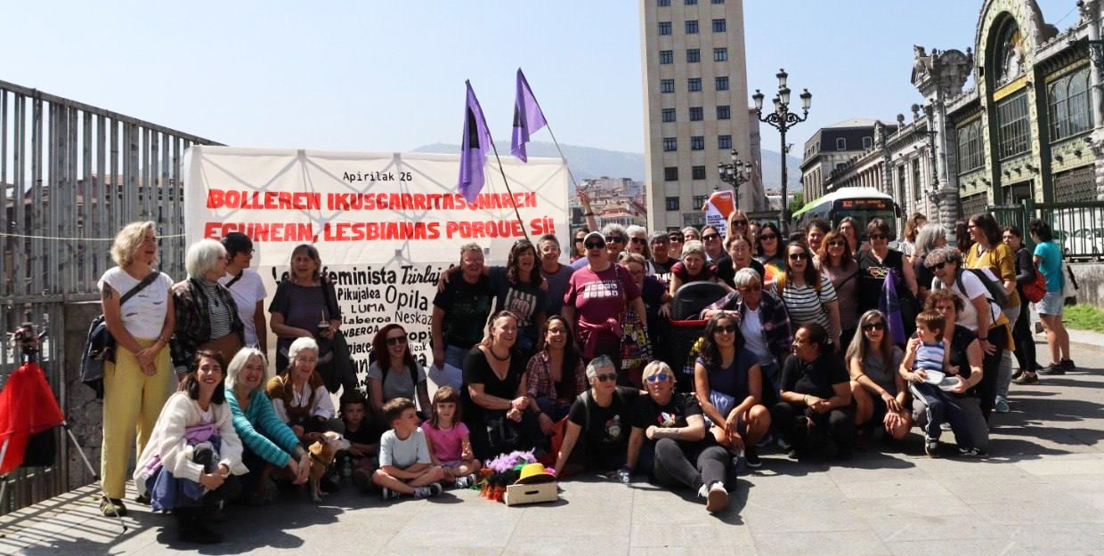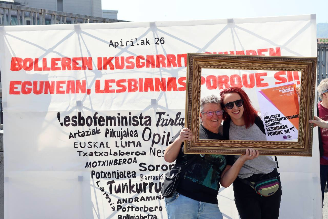 “Frente a la heteronorma, la bollera es el único camino. ¡Lesbianas porque sí!”. Bajo ese lema, la Plaza de las Mujeres de Bilbao acogió ayer, 26 de abril, una concentración y performance convocada por Bilbo Feminista Saretzen con motivo del Día de la Visibilidad Lésbica.