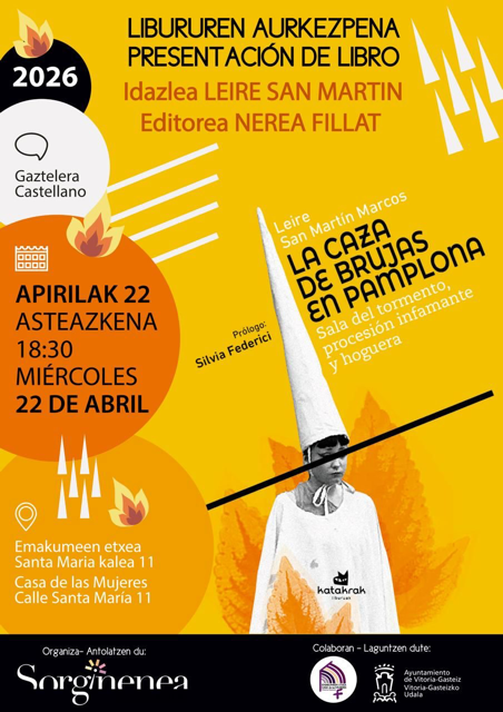La autora Leire San Martín Marcos presentará su libro 'La caza de brujas en Pamplona', acompañada por la editora Nerea Fillat. La obra aborda los procesos de persecución y violencia vinculados a la caza de brujas, poniendo el foco en el contexto histórico de Pamplona.