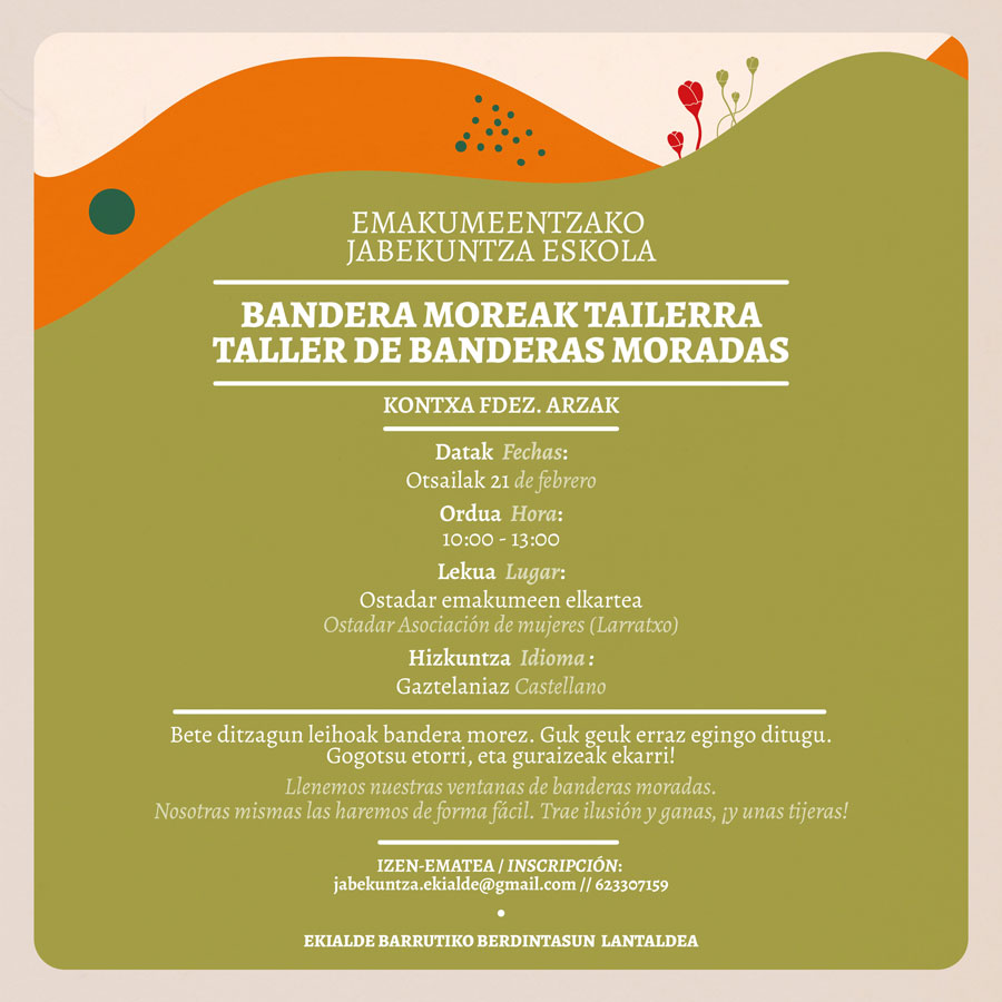 Este taller propone la elaboración artesanal de banderas moradas para llenar de reivindicación ventanas y balcones. Las sesiones estarán impartidas por Kontxa Fdez. Arzak y están dirigidas a mujeres interesadas en participar en un espacio creativo y colectivo.